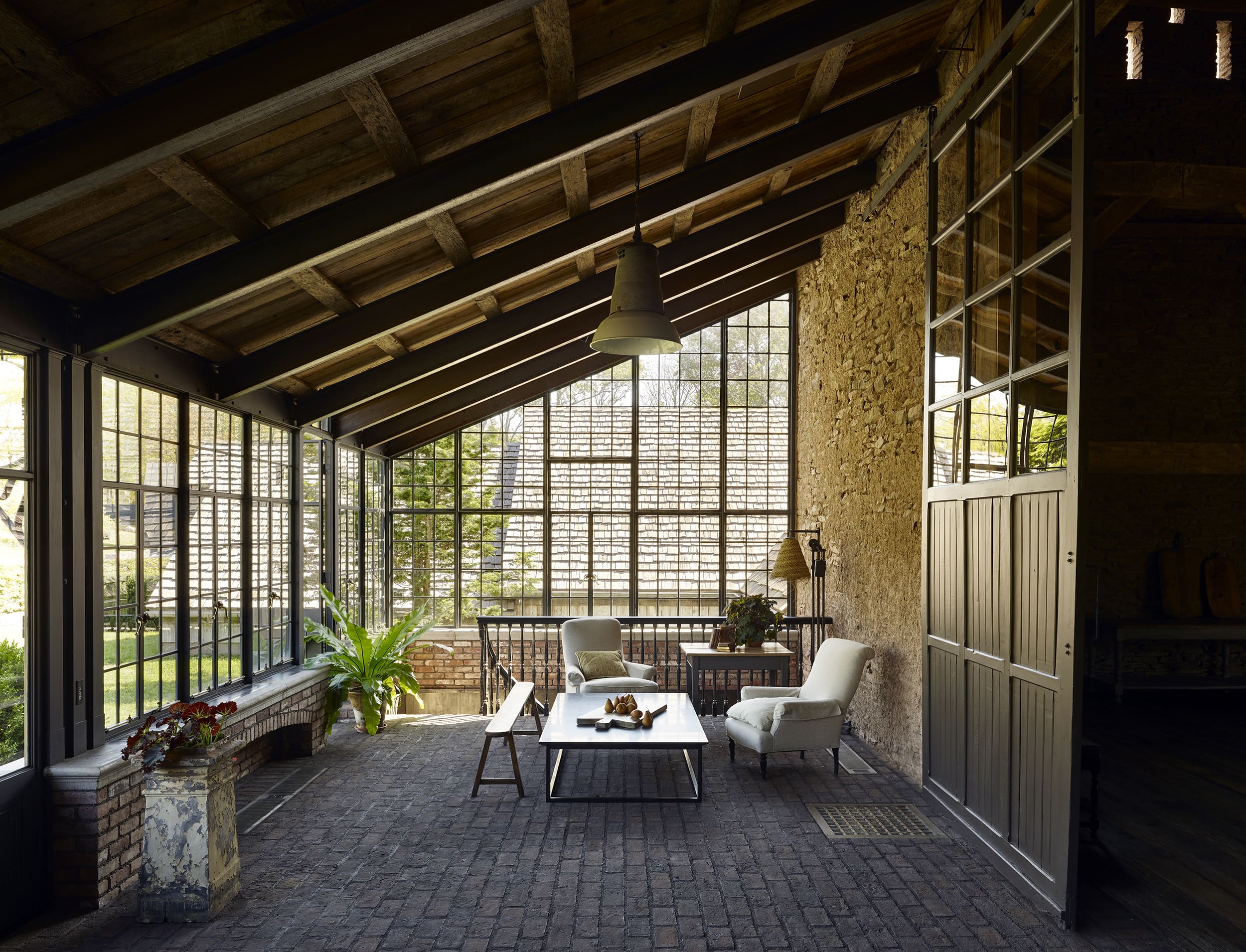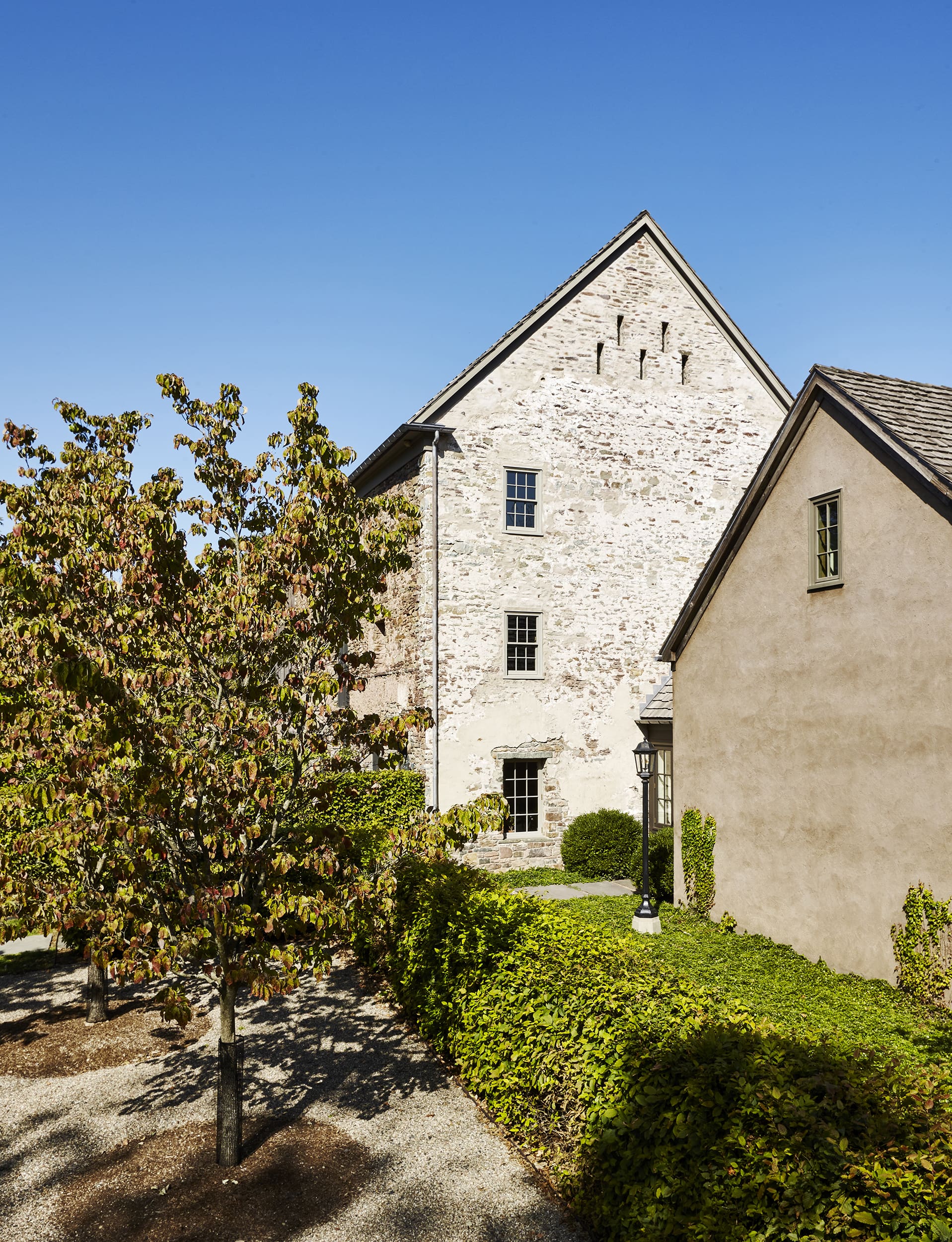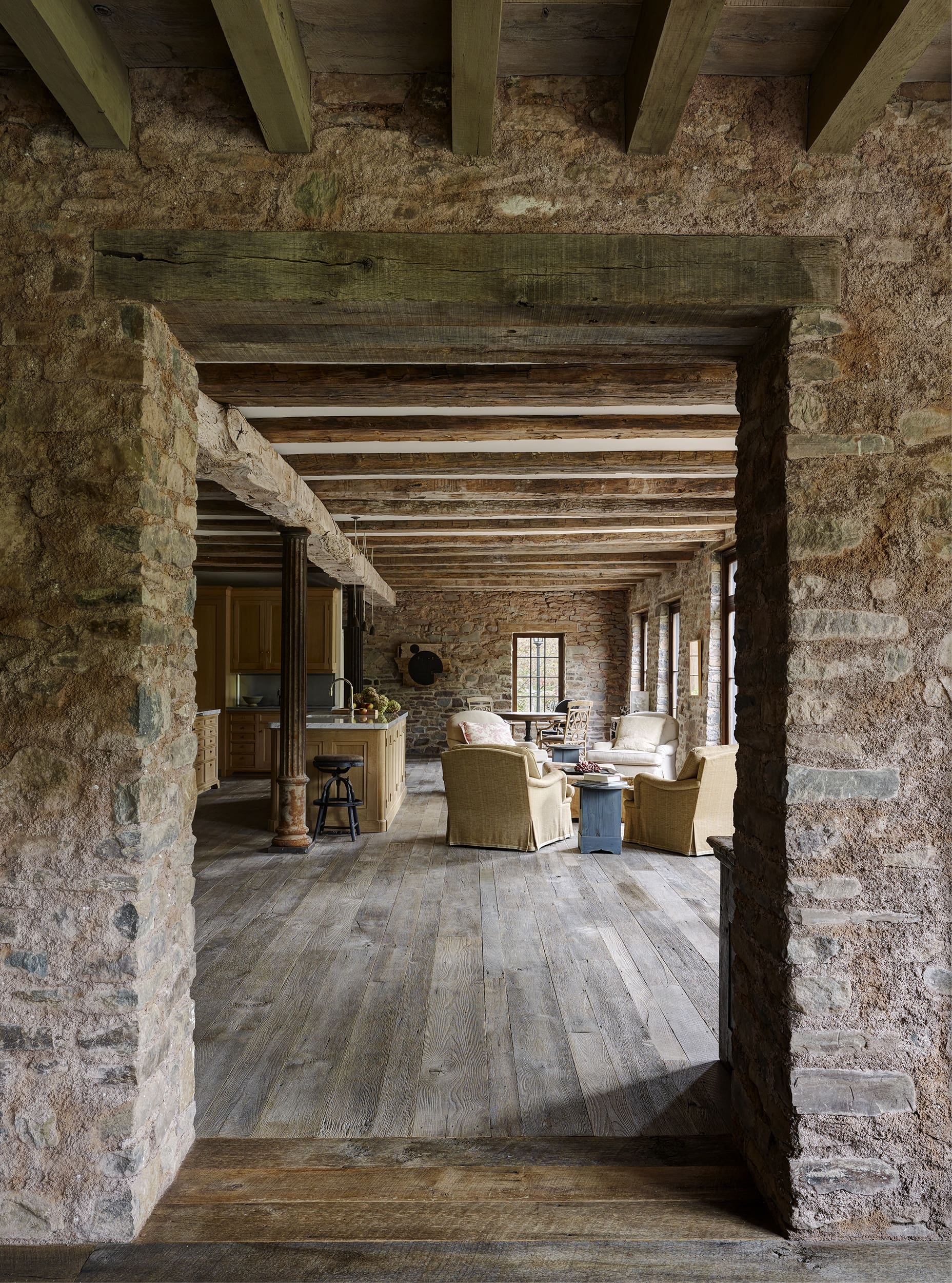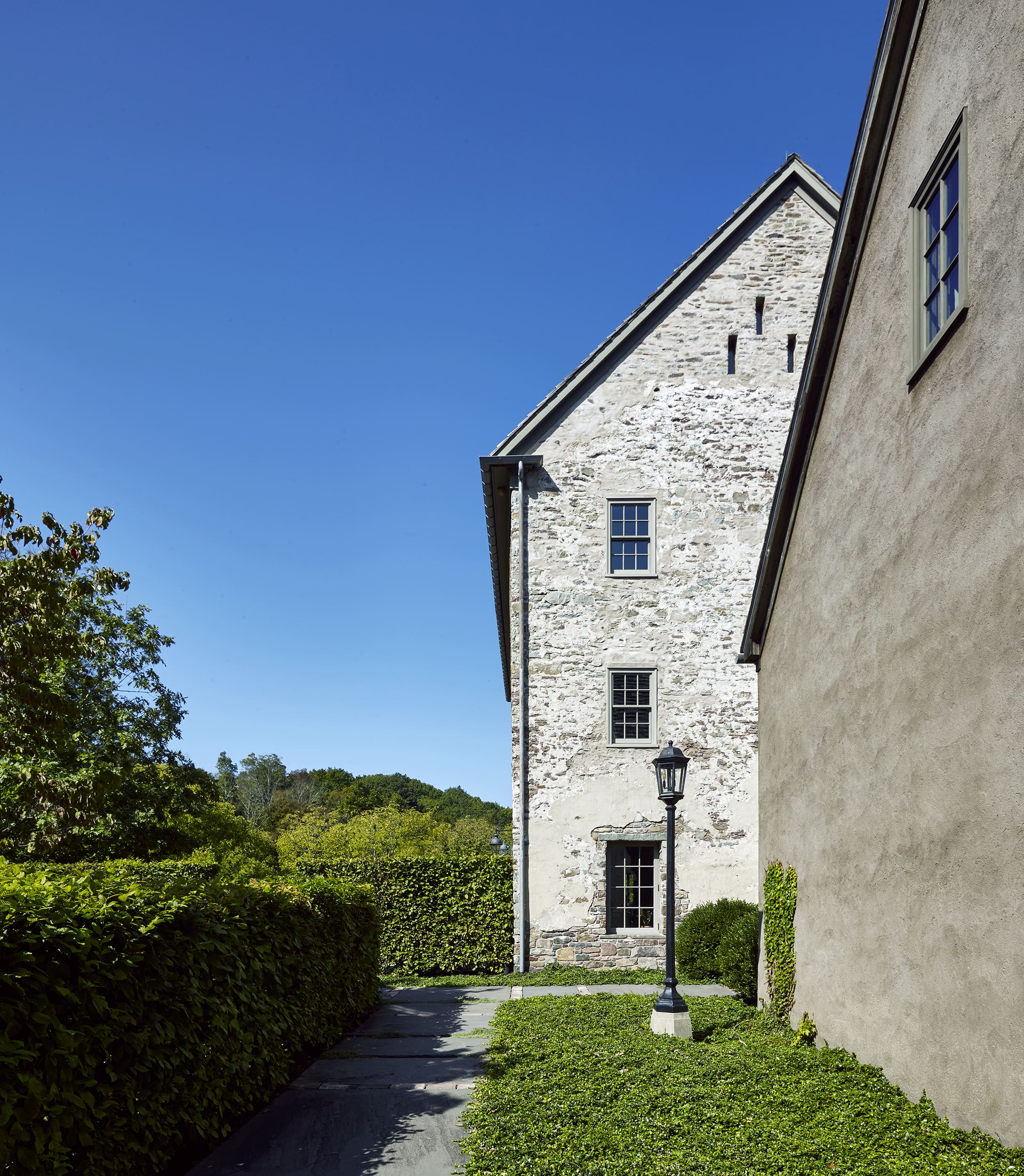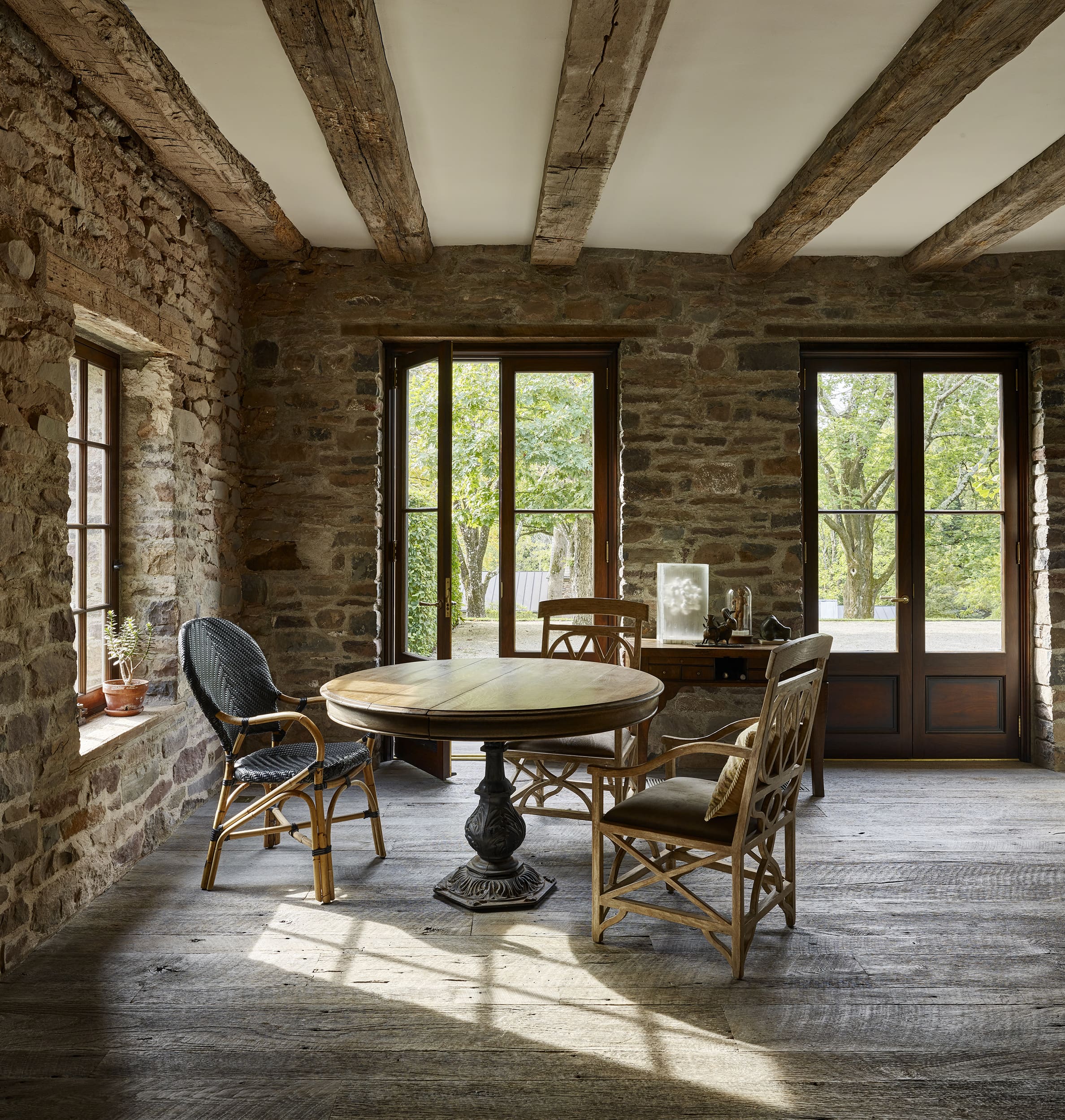 In keeping with the look of the stone barn, the exteriors of the additions were kept very simple, stoic to work with the simplicity of the barn. The interiors are threefold : starting with the 19th c. barn and entry, then a large room with 19thc French panelling and finally a master suite wing that is modern in feel.
