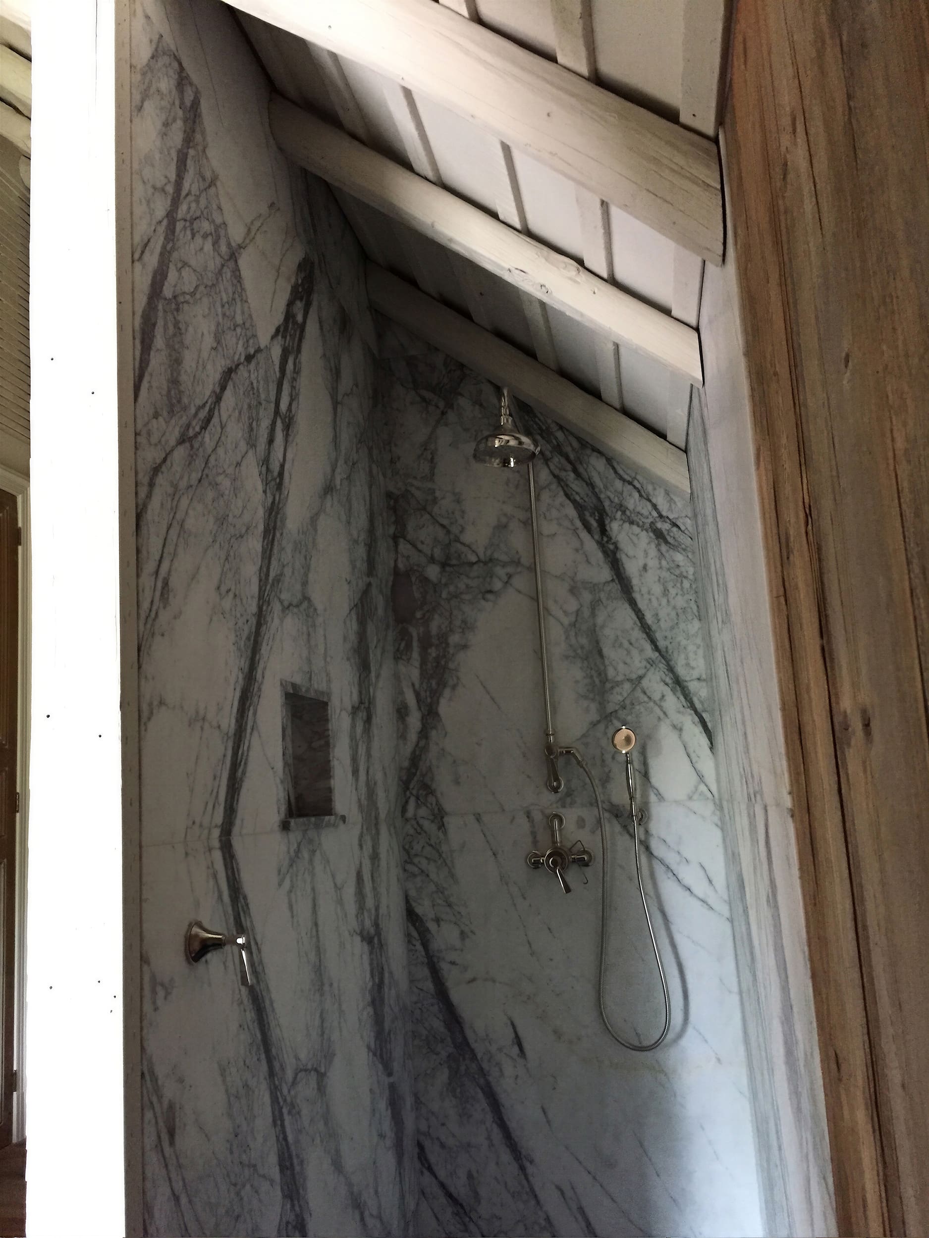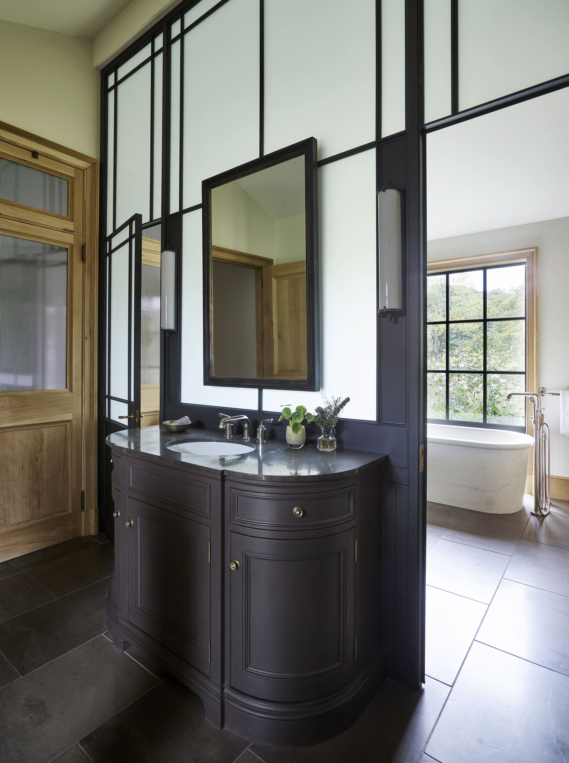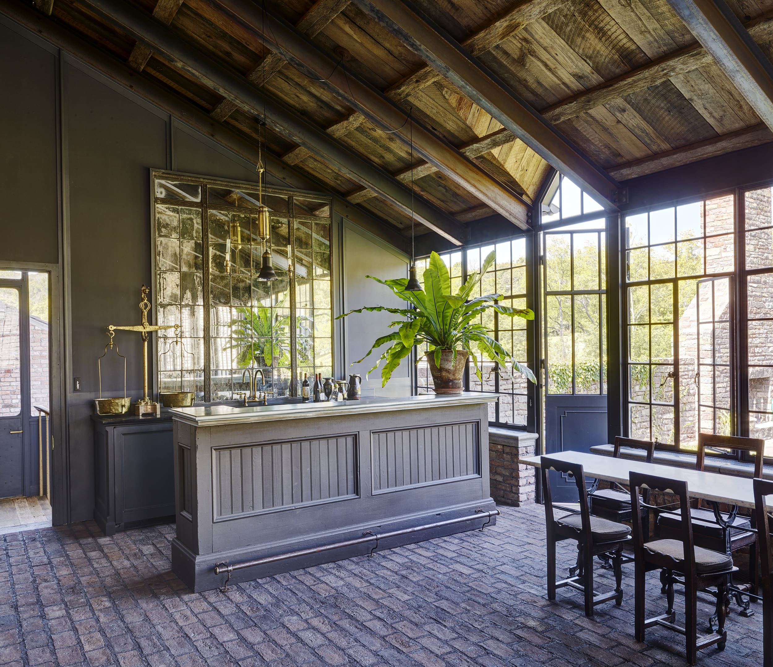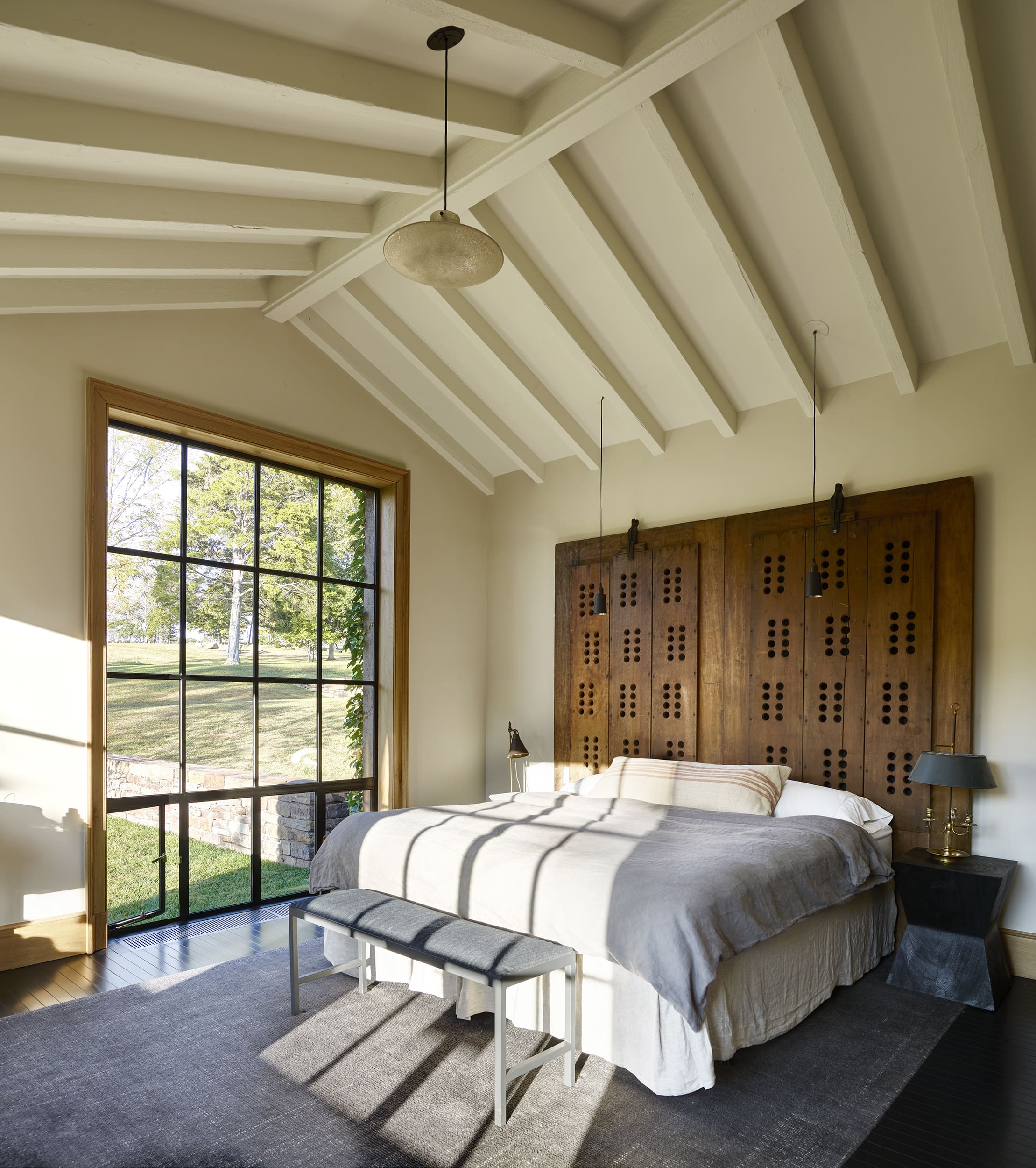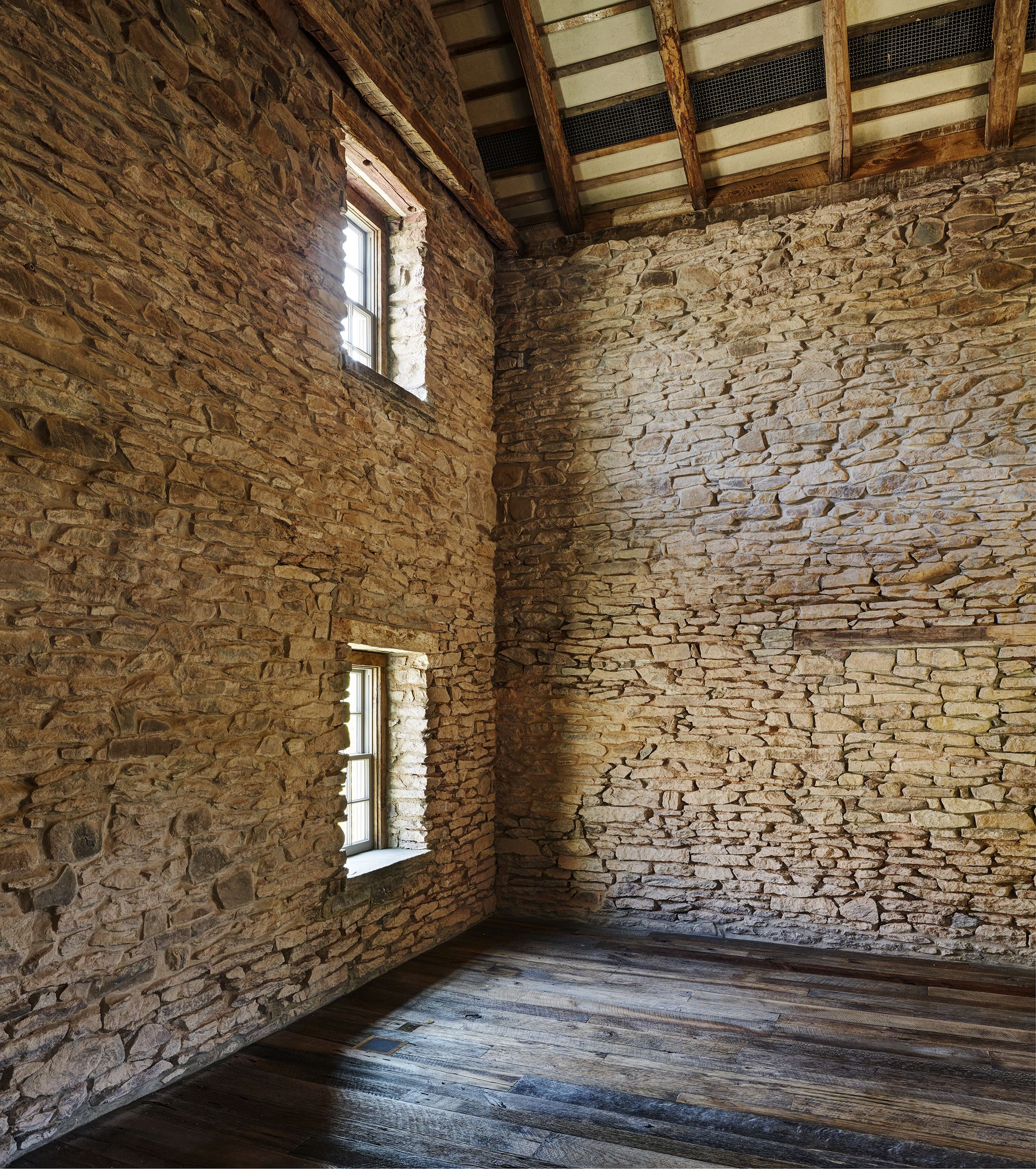 In keeping with the look of the stone barn, the exteriors of the additions were kept very simple, stoic to work with the simplicity of the barn. The interiors are threefold : starting with the 19th c. barn and entry, then a large room with 19thc French panelling and finally a master suite wing that is modern in feel.